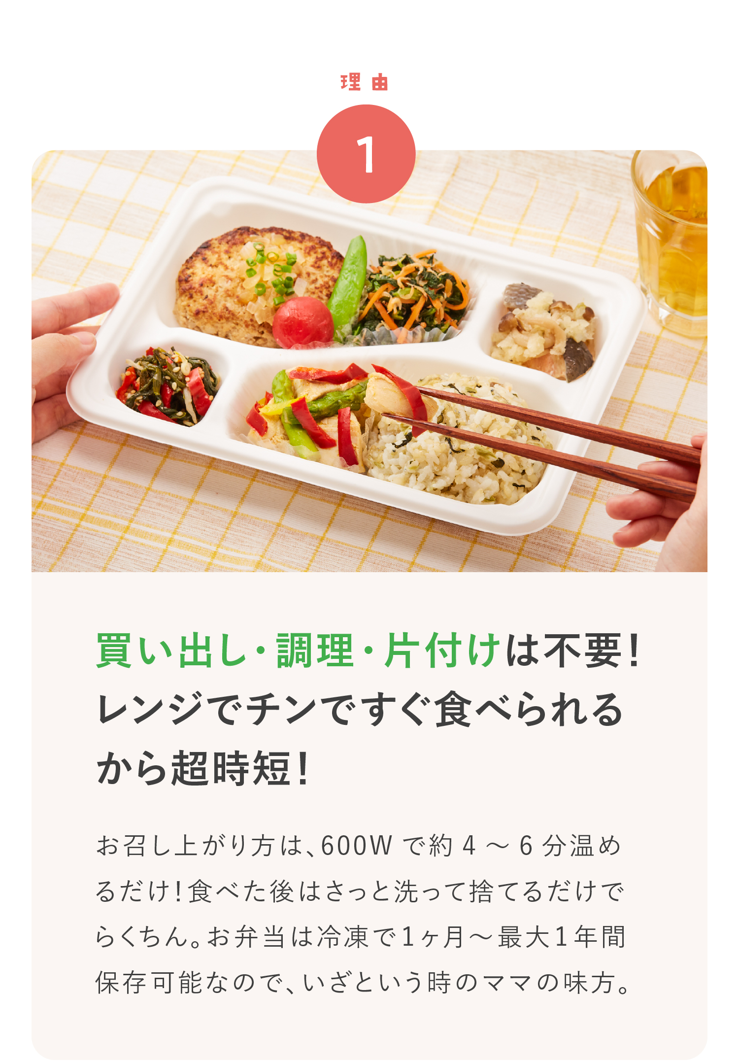 冷凍で届くから、冷凍庫にしまっておいていざって時に電子レンジでチン!するだけ。これならパパにもできるし、罪悪感なく「今日はお弁当にしよう!」って思えるのも嬉しい!